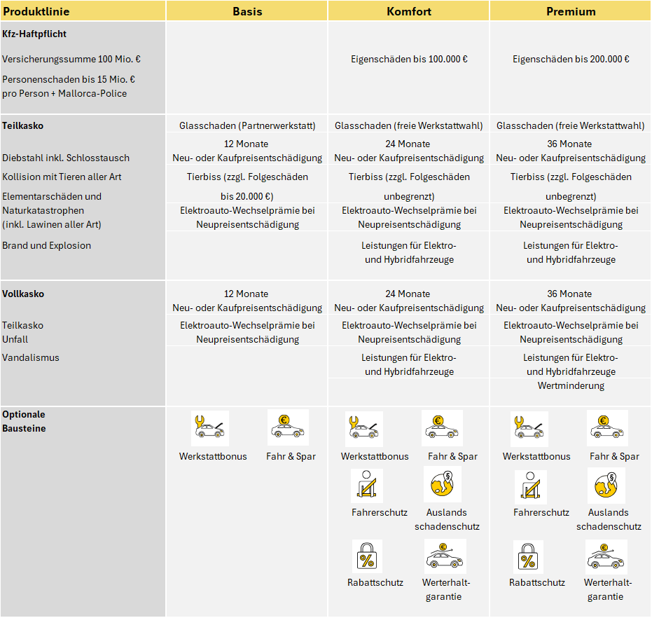 - Eine leistungsstarke Grunddeckung mit Kfz-Haftpflicht-, Teil- und Vollkaskoversicherung
