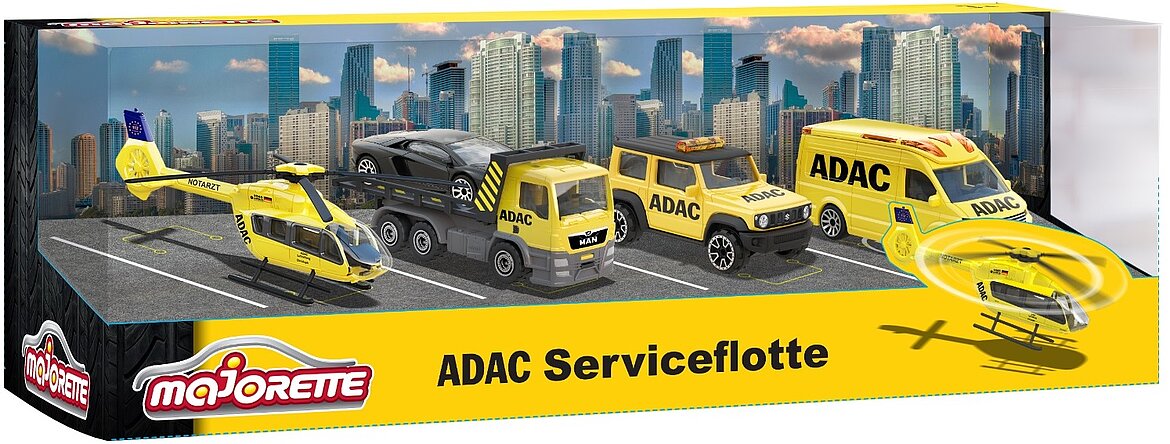 Die Majorette ADAC Serviceflotte überzeugt mit Power und perfektem Design. Das 5-teilige Geschenkset mit kleinen Helfern kommt in einer attraktiven Geschenkverpackung. Enthalten sind Fahrzeuge und ein Helikopter im ADAC Design wie der Volkswagen Crafter, Suzuki Jimny, MAN TGS Abschleppwagen mit Ford GT und ein Airbus H145 Rettungshelikopter. Jedes Fahrzeug ist mit Freilauf ausgestattet und besitzt ein hochwertiges Diecast-Metallgehäuse. Dem Einsatz steht nichts mehr im Wege.